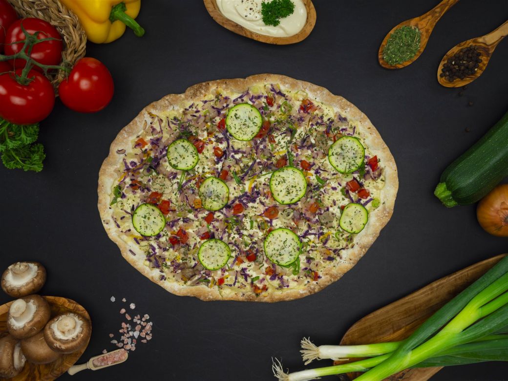 Hauchdünner Flammkuchenboden mit Sojacreme, belegt mit Tomaten, Zucchini, Zwiebeln, Frühlingszwiebeln, Paprika, Rotkraut und Pilzen, 350 g.