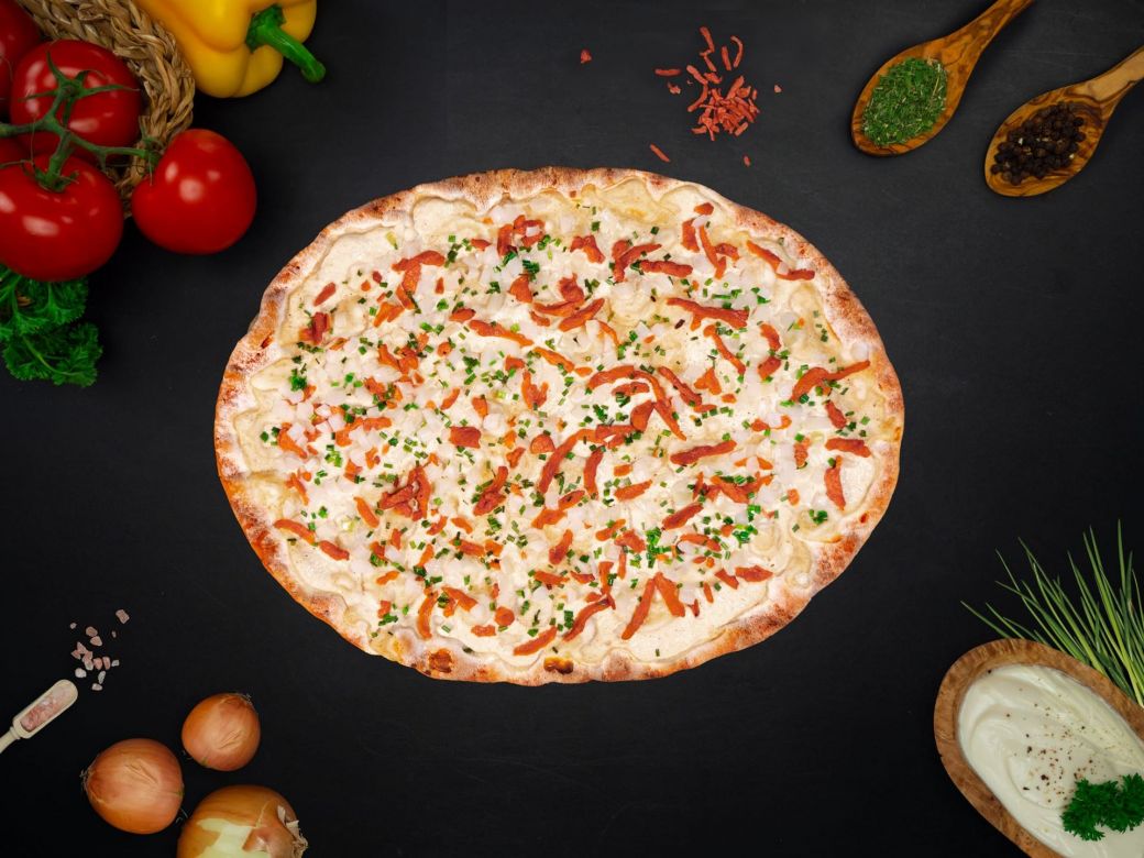 Hauchdünner Flammkuchenboden mit Schmandcreme, belegt mit Speck und Zwiebeln, 300 g.