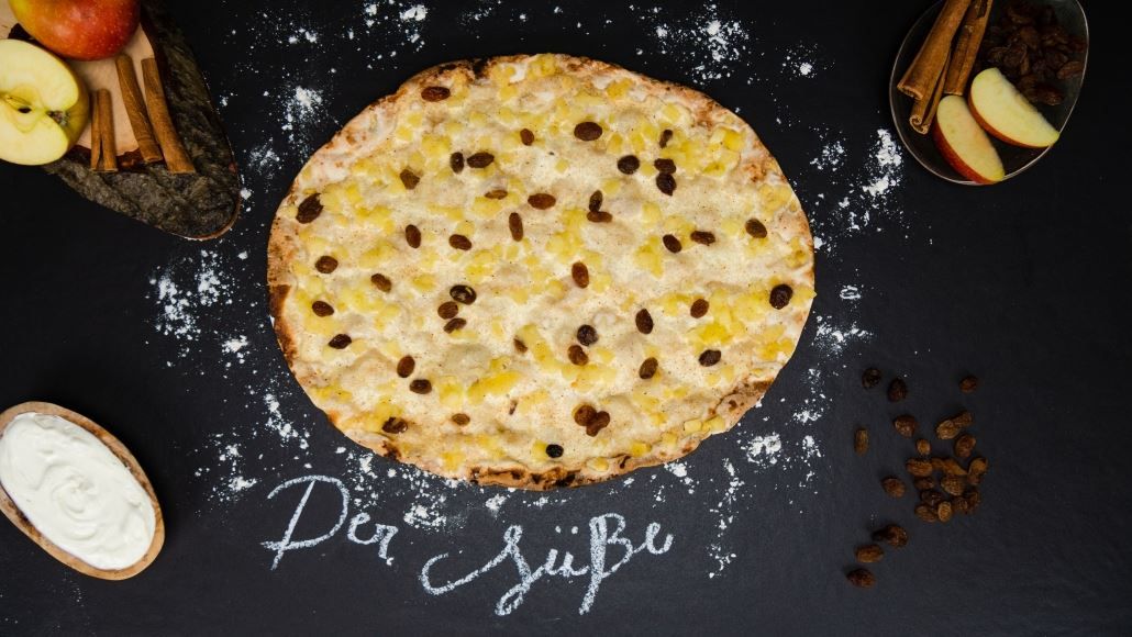 Hauchdünner Flammkuchenboden mit leicht gesüßter Schmandcreme, belegt mit Apfelstückchen, Rosinen und Zimt-Zucker, 300 g.