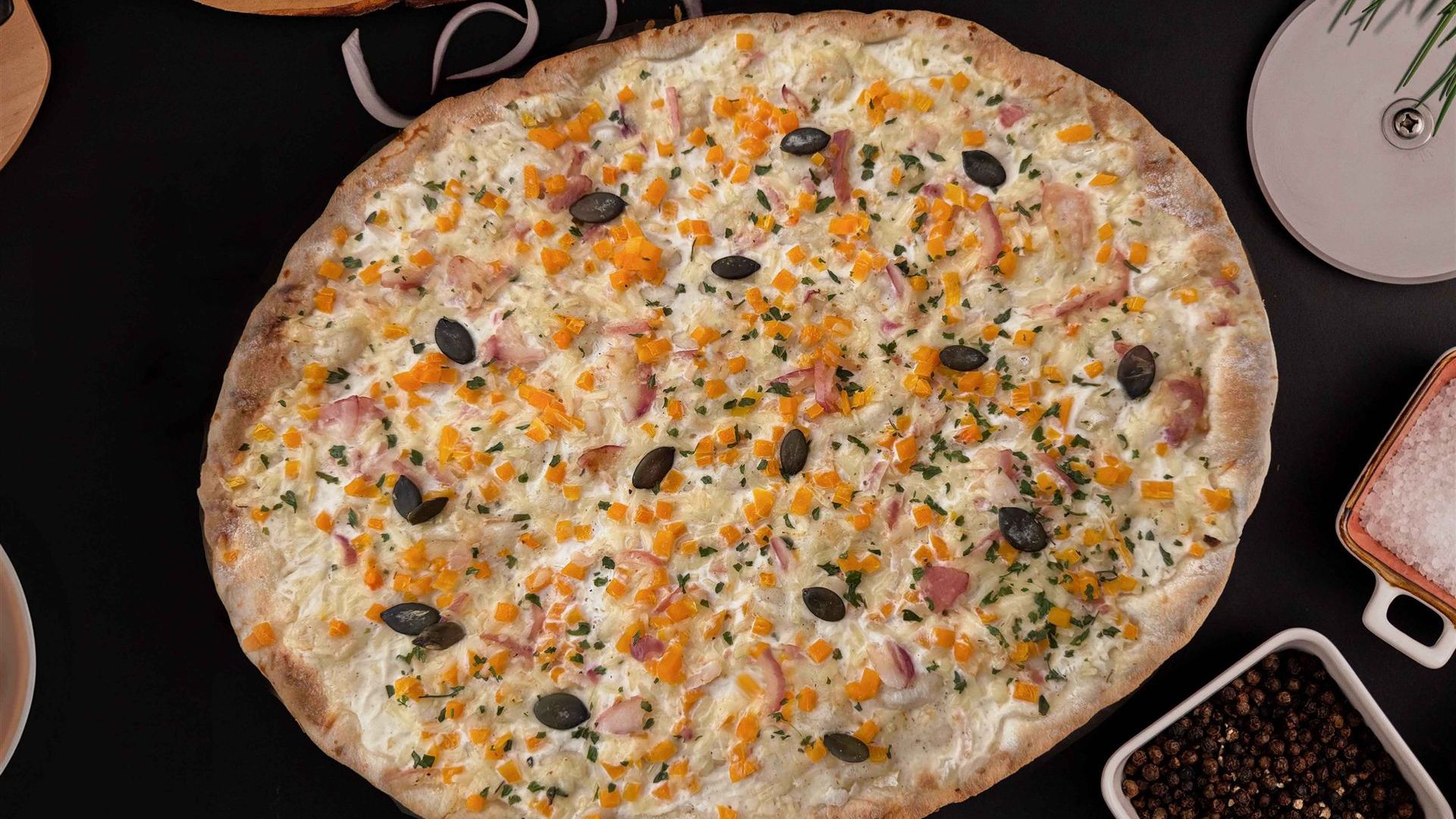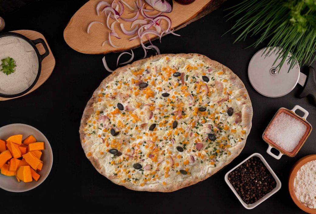Hauchdünner Flammkuchenboden mit Schmandcreme, belegt mit kräftigem Bergkäse, zartem Kürbis, roten Zwiebeln, gerösteten Kürbiskernen und Petersiele, 320 g.