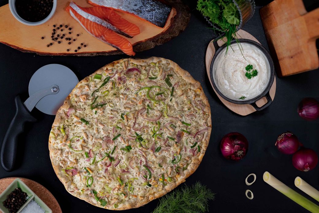 Hauchdünner Flammkuchenboden mit Schmandcreme, belegt mit Wildlachs, Zwiebeln, Lauch und einer Prise Dill, 300 g.